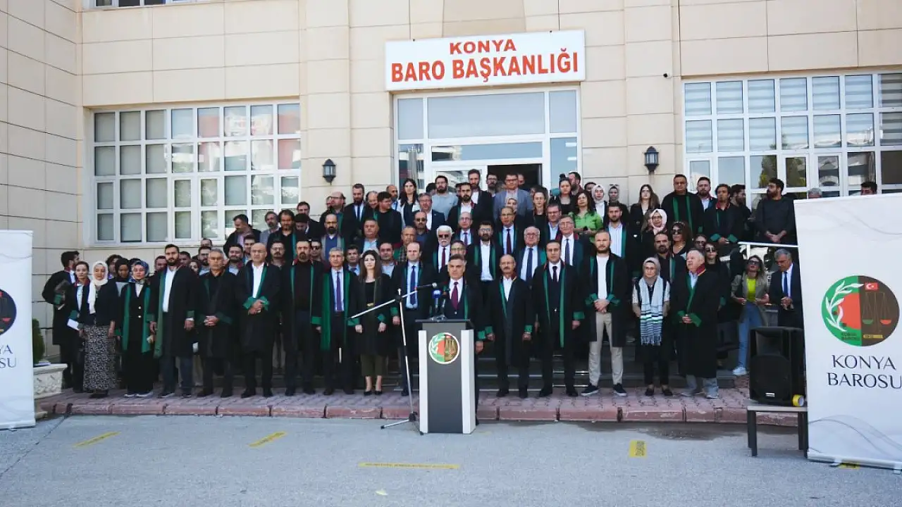 Konya Barosu önünde bir araya gelen avukatlar adına basın açıklaması yapan Baro Başkanı Oktay Unkur, İsrail'in Gazze'de soykırım uyguladığını, kentteki avukatlar olarak bu vahşeti lanetlediklerini söyledi.