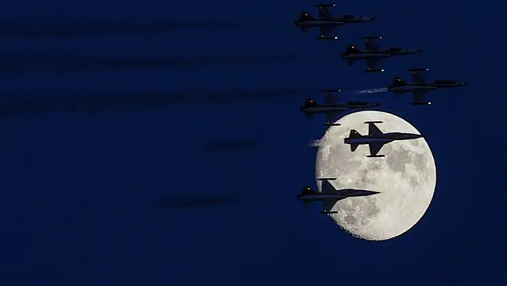 Fotoğraf, Konya'da düzenlenen 5. İslami Dayanışma Oyunları açılış töreni öncesi Türk Yıldızları'nın yaptığı gösteriyi, gökyüzünde beliren ay ile aynı karede yansıtıyor.