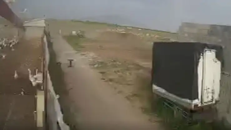 Konya'nın Çumra ilçesinde, 20 Mayıs'ta etkili olan fırtına nedeniyle bir kaz çiftliğinin çatısının uçtuğu anlar bir başka iş yerinin güvenlik kamerasınca kaydedildi.