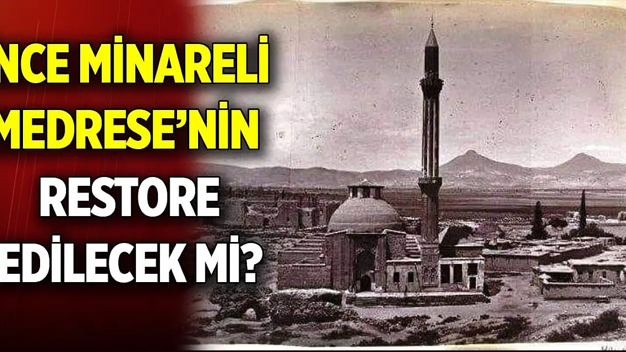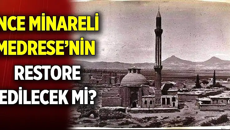 İnce Minareli Medrese'nin en dikkat çekici özelliği, 42 metre yüksekliğindeki ince minaresidir. Ancak minare zamanla yıkılmış ve günümüze tek şerafesinin bulunduğu alan kalmış. 100 yıl öncesindeki çekilen fotoğrafta minarenin tam hali yer aldı. Yapılan yorumlarda medrese minaresinin eski haline gelmesi konuşuldu.