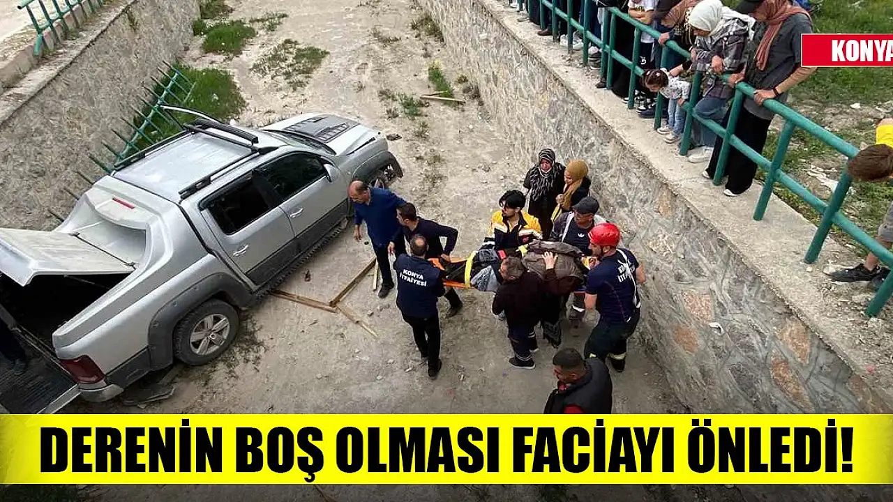 Konya'da otomobil ile çarpışan pikabın dereye düşmesi sonucu meydana gelen trafik kazasında 4 kişi yaralandı. Pikabın düştüğü derede suyun olmaması facianın önüne geçerken, yaralanan 4 kişi hastaneye kaldırıldı. Kazayla ilgili soruşturma başlatıldı.
