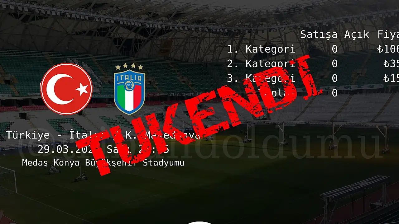 A Millî Takımımızın İtalya-Kuzey Makedonya maçının sonucunda belli olacak rakibi ile 29 Mart 2022 Salı günü Konya'da oynayacağı milli maçın bilet satışı sona erdi. Konya Büyükşehir Stadyumu'nda saat 21.45'te başlayacak müsabaka için satışa sunulan biletlerin tamamı tükendi.