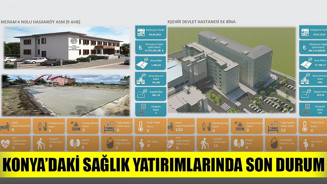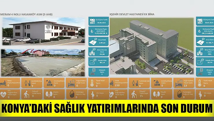 Prof. Dr. Koç, tüm bu yatırımların yanı sıra birinci basamak sağlık hizmeti sunacak olan Altınekin Toplum Sağlığı Merkezi ve Aile Sağlığı Merkezi (ASM) , Ereğli Türbe ASM, Seydişehir 2 Nolu ASM ve 112 ASHİ, Beyşehir 1 Nolu ASM ve 112 ASHİ ile Meram 4 nolu ASM ve 112 ASHİ inşaatlarının da hızla devam ettiğini belirtti.