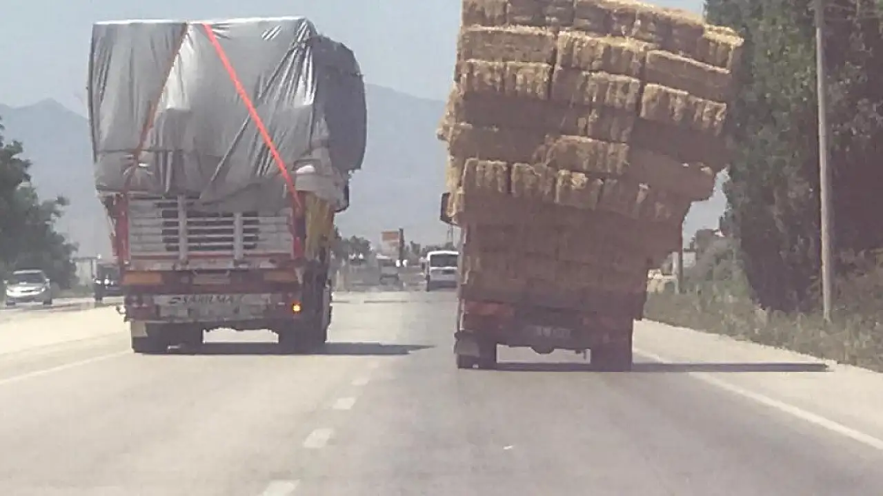 Konya- Adana karayolu Ereğli ilçesi Kargacı mevkisinde, kasasının iki katı saman balyası yüklü kamyon, aynı şeritte seyreden diğer sürücüleri korkuttu.