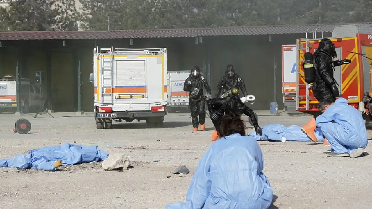 Konya'da, Türkiye Afet Müdahale Planı (TAMP) kapsamında, Kimyasal Biyolojik Radyolojik Nükleer Tehditler (KBRN) Saha ve Masabaşı Tatbikatı gerçekleştirildi.