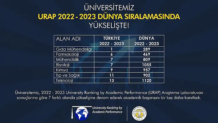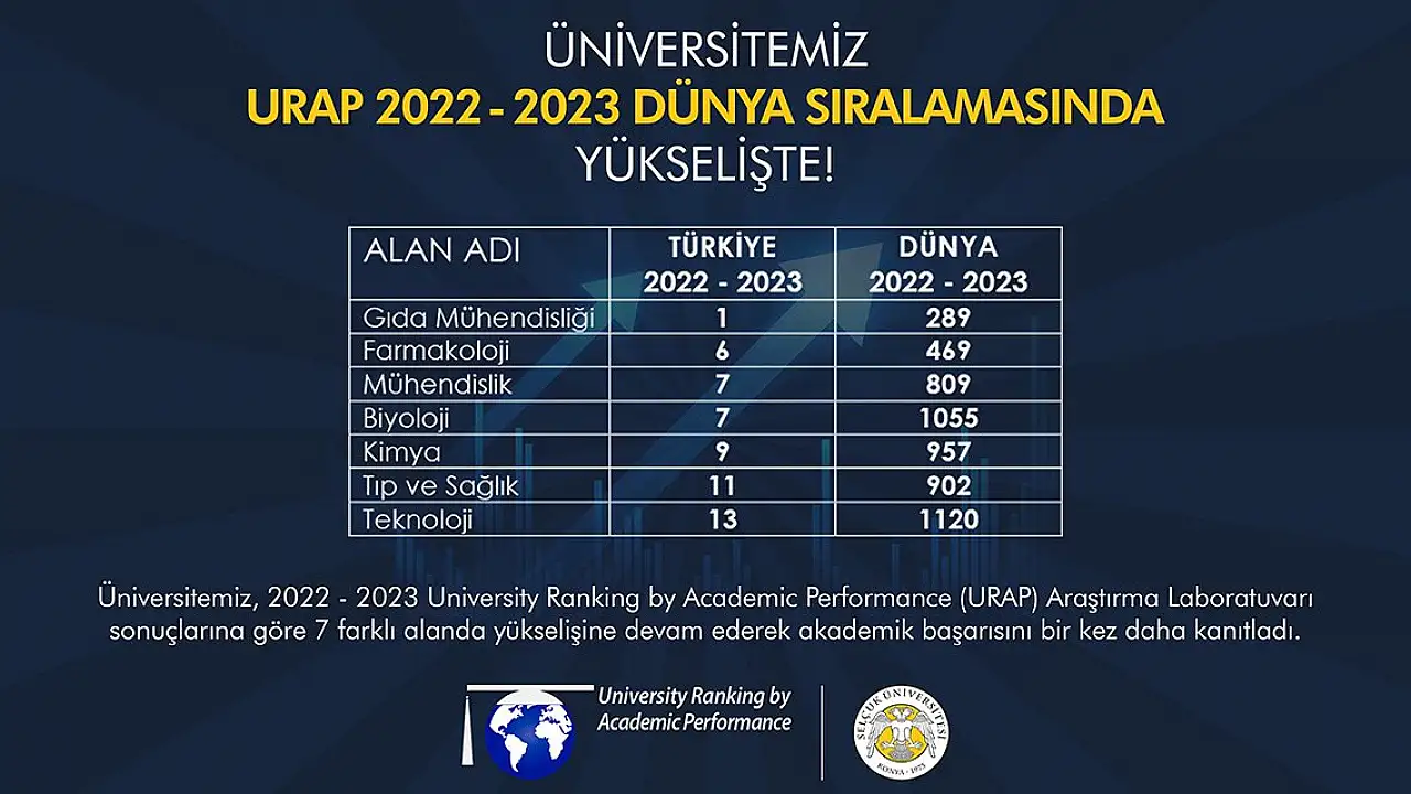 Selçuk Üniversitesi, URAP 2022 – 2023 Dünya Alan Sıralaması'nda gıda mühendisliği, farmakoloji, tıp ve sağlık, mühendislik, biyoloji, kimya ile teknoloji alanında dünya sıralamalarında üstün başarı elde etti.