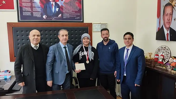 Konya'da düzenlenen bilek güreşi yarışmasında ikinci olan Emine Alan, Hüyük ilçesindeki okulunda ödüllendirildi.