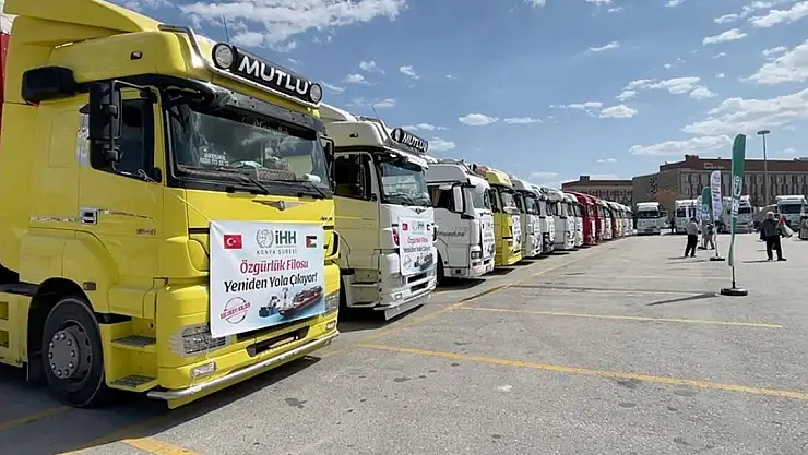 Konya İnsan Hak ve Hürriyetleri (İHH) İnsani Yardım Derneği tarafından, 'Özgürlük Filosu Yeniden Yola Çıkıyor' kampanyası kapsamında toplanan gıda ve çeşitli ihtiyaç malzemeleri yüklü 22 tır, Gazze'ye uğurlandı.