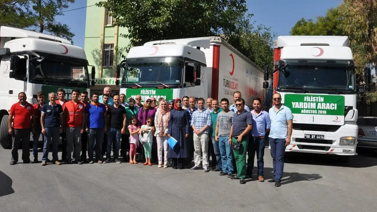 Dernek Müdürü Aygül Erdem, dernek önünde düzenlenen uğurlama töreninde, yardım malzemesinin, Başbakanlık ve Kızılay'ın organizasyonuyla, Fi̇li̇sti̇n'e gi̇decek yardım gemi̇si̇yle ulaştırılacağını belirtti.