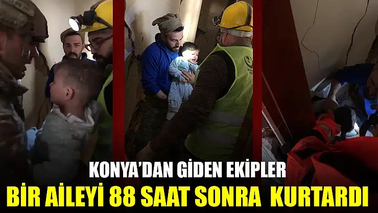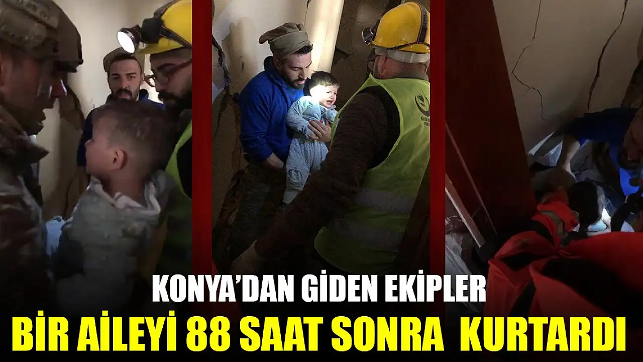 Merkez üssü Kahramanmaraş'ın Pazarcık ve Elbistan ilçeleri olan ve 10 kenti vuran 7.7 ile 7.6 büyüklüğündeki depremlerden sonra bölgeye giden çok sayıda ekip, enkazlarda arama- kurtarma çalışmalarını sürdürüyor. Hatay'ın Belen ilçesinde yıkılan Hisar Apartmanı'ndan ses geldiğini belirleyen Konya AFAD ile Konya 3'üncü Ana Jet Üs Arama Kurtarma personeli, apartmanın zemininde açtıkları boşluktan 5 kişilik bir aileye ulaştı. Hafif yaralı olarak 88 saat sonra enkazdan çıkarılan aile, hastanelere sevk edildi.
