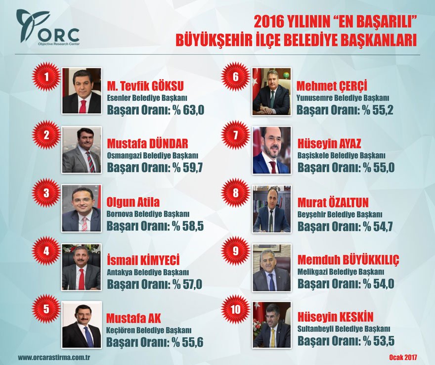 ORC Araştırma Şirketi’nin geride kalan 2016 yılının en başarılı Büyükşehir belediye başkanları ile büyükşehir ilçe belediye başkanlarını belirlediği her yıl geleneksel olarak düzenlediği anket çalışmasının sonuçları açıklandı. Yapılan açıklamaya göre, ORC Araştırma Şirketi, araştırmasını 5 Ocak-20 Ocak 2017 tarihleri arasında 30 Büyükşehirin tüm ilçelerinde toplam 19 bin 520 kişi ile “CATI-Bilgisayar Destekli Telefon Görüşmesi” yöntemiyle gerçekleştirirken, en başarılı belediye başkanları listesinde, yüzde 52’nin üzerinde başarı oranı yakalayan belediye başkanları yer aldı.