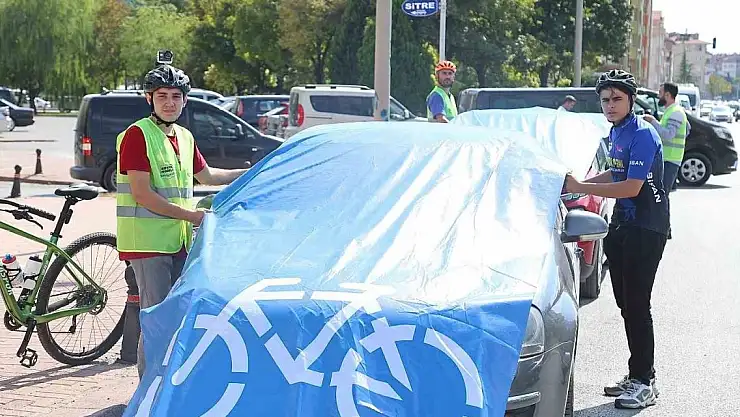 Konyalı bisikletseverler, "Avrupa Hareketlilik Haftası" çerçevesinde şehir merkezinde bisiklet yoluna park eden araçların üzerini mavi brandalarla kaplayarak bisiklet yolunun işgal edilmemesi gerektiğine dikkati çekti.