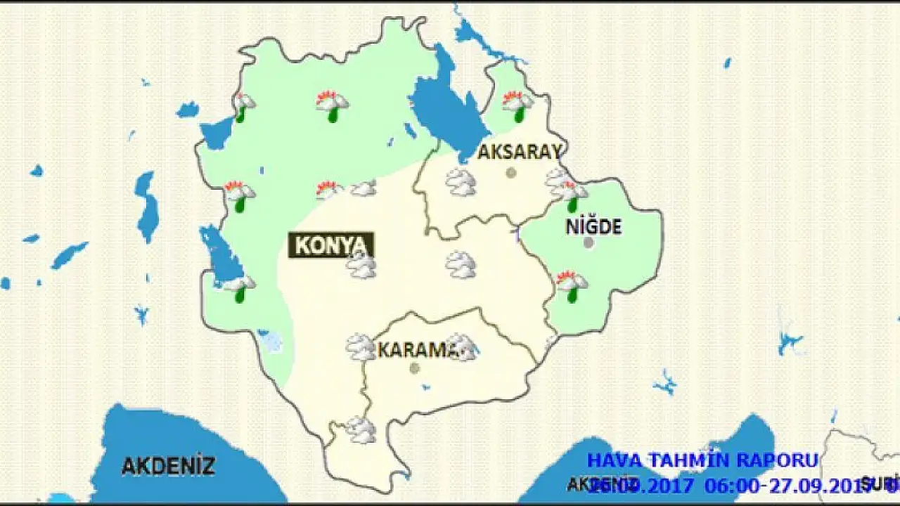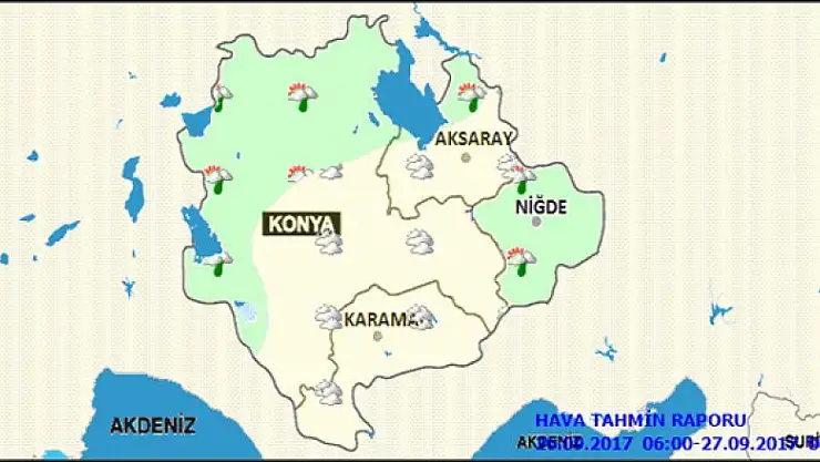 Yetkililer, öğle saatlerinden sonra Konya'nın kuzey ve batı kesimleri (Ahırlı, Akşehir, Beyşehir, Cihanbeyli, Çeltik, Derbent, Derebucak, Doğanhisar, Hüyük, Ilgın, Kadınhanı, Kulu, Sarayönü, Tuzlukçu, Yalıhüyük, Yunak ilçeleri) ile Niğde çevrelerinin hafif sağanak yağışlı geçeceğini aktardı.