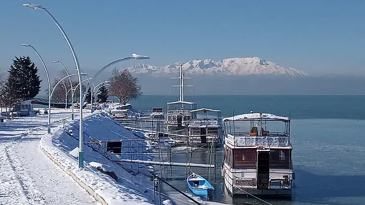 Konya'nın denizi olarak bilinen Beyşehir'de göl manzarası, kar ve doğanın birleşimi kartpostallık görüntü ortaya çıkardı.