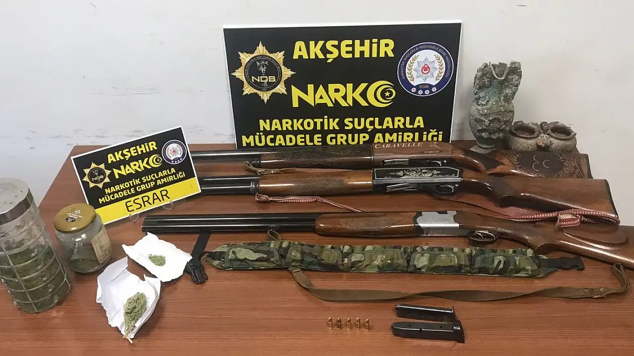 M.K., B.A., M.O., İ.K., A.K., H.K. ve A.T. isimli şahıslara ait ev ve iş yerlerinde yapılan aramalarda 4 parça halinde 115,27 gram esrar, 3 adet ruhsatsız av tüfeği, 2 adet tabanca şarjörü, 5 adet tabanca fişeği, 18 adet av fişeği ve 2 adet tarihi eser niteliğinde vazo ele geçirildi.