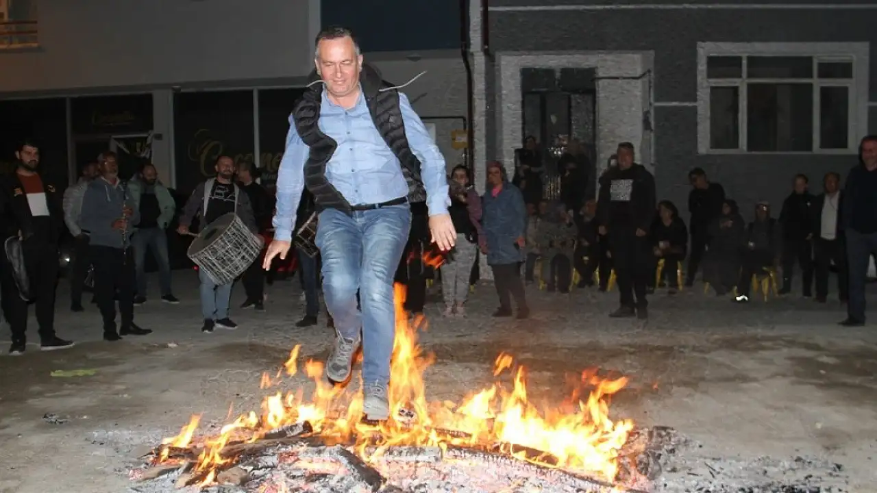 Hacıarmağan Mahallesi meydanında toplananlar, yakılan ateşinin üzerinden atladı, baharın gelişini davul zurna eşliğinde kutladı.
