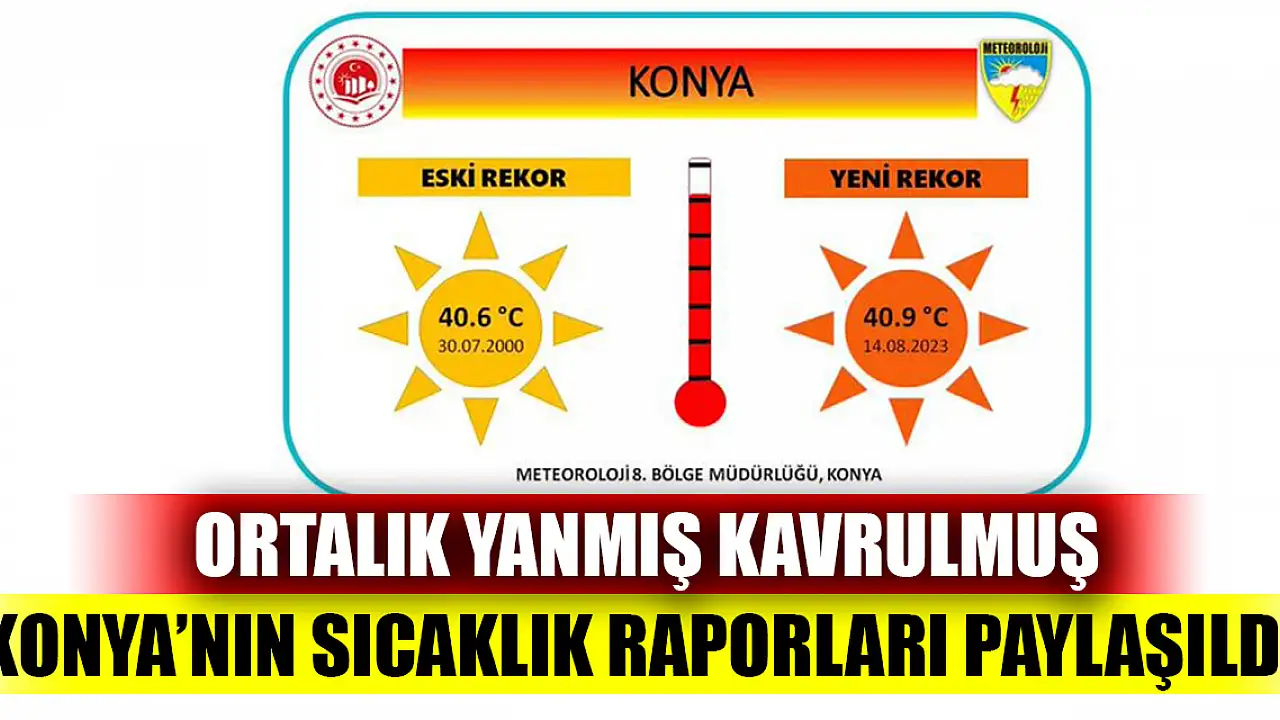 Konya'da Kuzey Afrika'dan gelen kavurucu sıcaklıklar etkisini göstermeye devam ediyor. Termometreler 40 dereceyi gösterirken Konya Meteoroloji Müdürlüğü rekor sıcaklık verilerini paylaştı. Buna göre 30 Temmuz 2000 tarihinde 40.6 derece ile kırılan sıcaklık 23 yıl sonra 14 Ağustos 2023 tarihinde kırıldı.