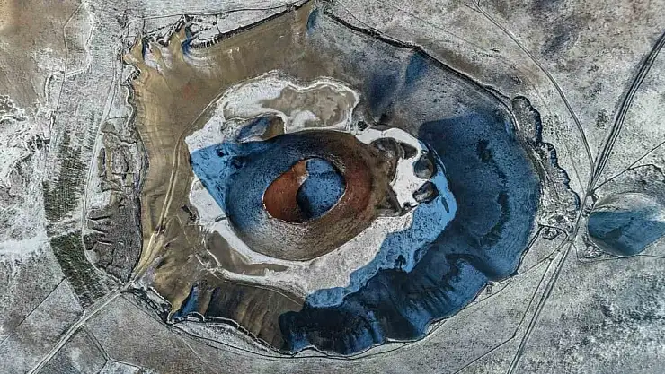 Konya'nın Karapınar ilçesinde etkili olan kar yağışı, dünyanın 'nazar boncuğu' olarak bilinen Meke Gölü'nü beyaza bürüdü. Kar örtüsüyle eşsiz bir görünüme kavuşan göl, doğa tutkunları ve fotoğrafçılar için büyüleyici manzaralar oluşturdu.