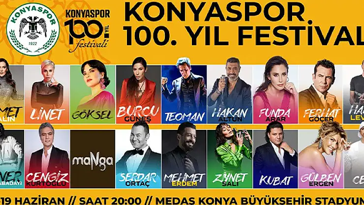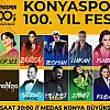 Spor Toto Süper Lig ekiplerinden Konyaspor'un 100'üncü yıl kutlamaları devam ediyor. Kutlamalar kapsamında düzenlenen festivalde, MEDAŞ Konya Büyükşehir Stadyumu'nun içinde ve dışında çeşitli etkinlikler gerçekleştiriliyor. Işık, lazer ve görsel şovların düzenlendiği festivalde, stadyum dışına kurulan yaklaşık 300 stantta vatandaşlar yöresel yemekleri de tatma imkanı buluyor.(Spor Servisi)