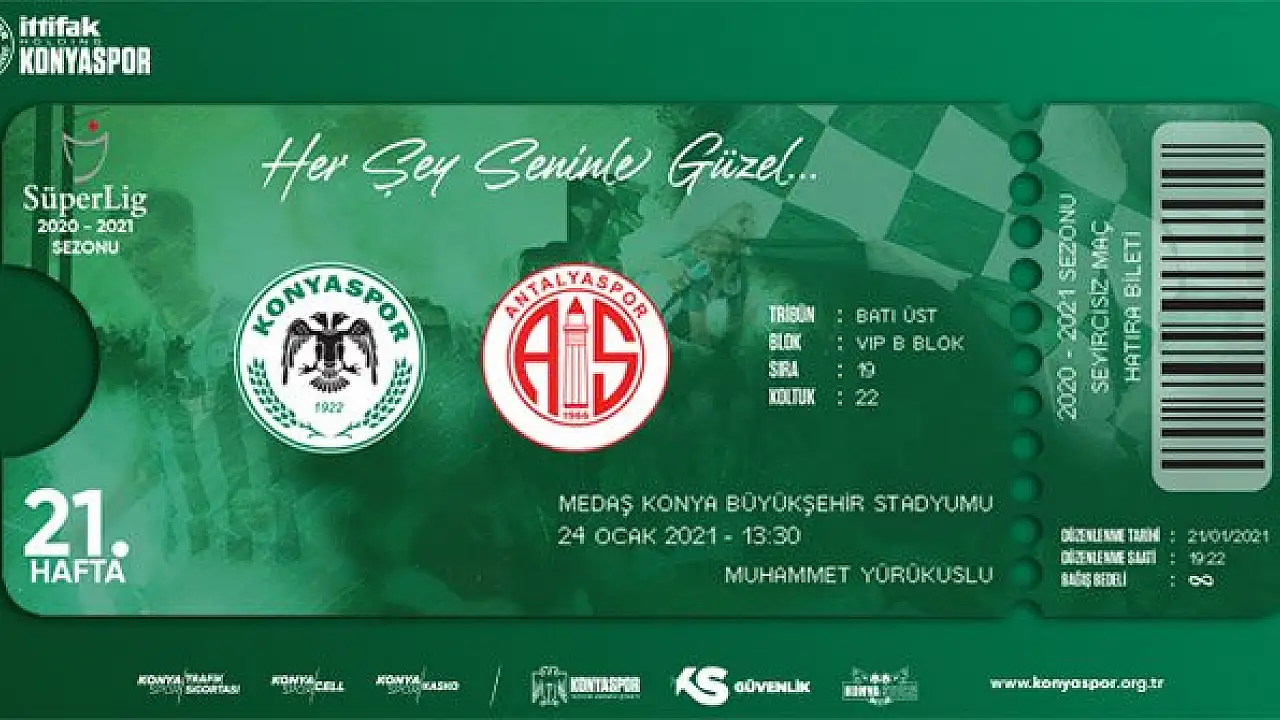 İttifak Holding Konyaspor'un Süper Lig'in 21. haftasında oynayacağı Fraport TAV Antalyaspor maçının hatıra biletleri satışa çıktı.