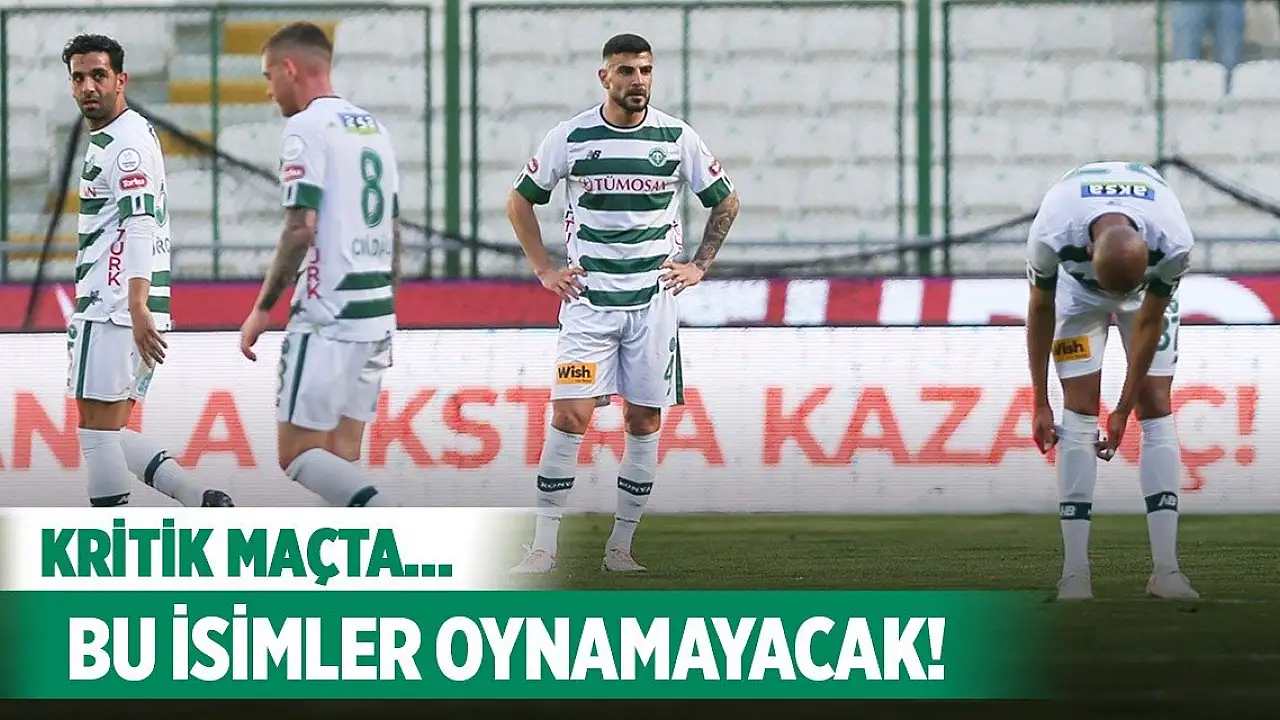 Konyaspor’da eksikler can sıkıyor. Anadolu Kartalı için kritik öneme sahip olan Sivasspor maçı öncesinde çok sayıda eksik var. Yeşil beyazlılarda Uğurcan Yazğılı ve Teenage Hadebe sarı kart cezalısı olduğu için forma giyemeyecek. Sakatlığı bulunan Anderson Niangbo ve Emmanuel Boateng’in oynaması beklenmiyor. Sakatlığını atlatan Muhammet Demir ise antrenman eksikliği bulunuyor.