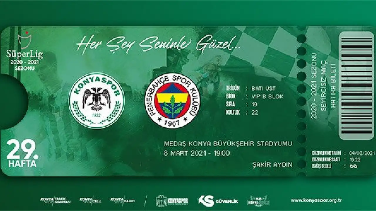 Yeşil beyazlı taraftarlar, http://hatirabilet.konyastore.com.tr/ adresinden ve Konyaspor Mobil Uygulamasından maçın biletlerini temin edebilecekler. Hatıra bilet satın almak isteyen taraftarlar, Adı – Soyadı, telefon numarası ile istediği tribünden bilet adetini seçecek ve SMS onayıyla doğrulama yapacak ödeme tamamlandıktan sonra biletlerim sekmesinden hatıra bilet görseline ulaşacak.