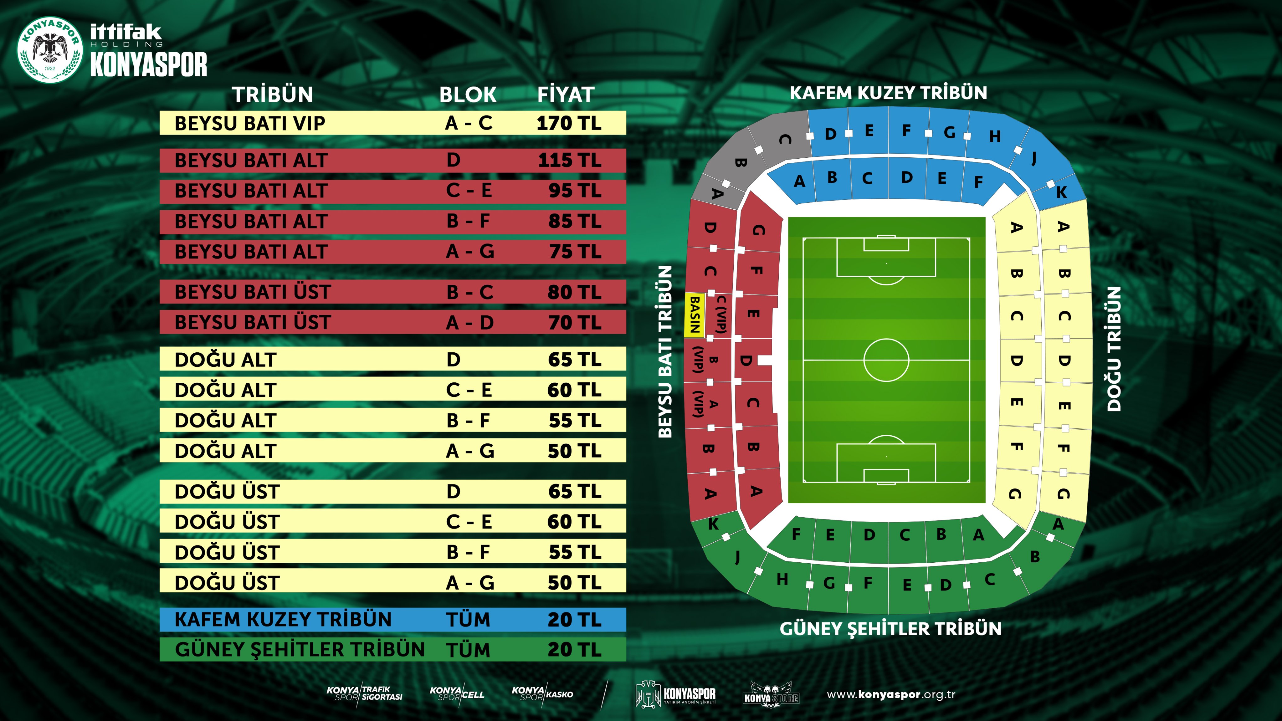 MEDAŞ Konya Büyükşehir Stadyumu’nda 5 Mart 2022 Cumartesi günü saat 19.00’da başlayacak karşılaşmanın elektronik biletleri satışa sunuldu. Bilet fiyatları 20 ile 170 TL arasında değişiyor. Stadyum gişelerinden ve passo.com.tr ’den satılacak Galatasaray maçı bilet fiyatları şöyle: