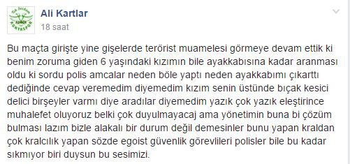 Konya Büyükşehir Arena Stadı girişinde taraftara yapılan arama yöntemi tepkiye yol açtı. Yeşil beyazlı bir taraftar sosyal medya hesabından yaptığı paylaşımda stada girerken güvenlik görevlileri tarafından en ince detayına kadar arandığını, kendisiyle birlikte 6 yaşındaki kızının da ayakkabı içine kadar sıkı bir şekilde aramadan geçtiğini ifade etti.