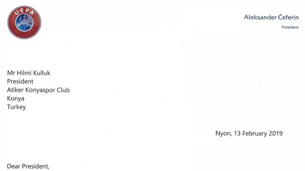 Atiker Konyaspor Başkanı Hilmi Kulluk, UEFA başkanlığına seçilen Aleksander Caferin'e tebrik mektubu yazdı. Başkan Ceferin de mektubunda Kulluk'a teşekkür ederek, Konyaspor'a başarı diledi