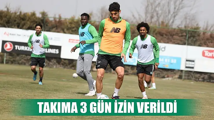 Giresunspor beraberliği sonrası haftayı ligden çekilen Hatayspor nedeniyle zorunlu bay geçecek olan Konyaspor'da futbolculara 3 gün izin verildi. Yeşil beyazlılar 17 Mart'ta oynayacakları Galatasaray maçı için hazırlıklarını çarşamba günü 17.30'da gerçekleştirecek.