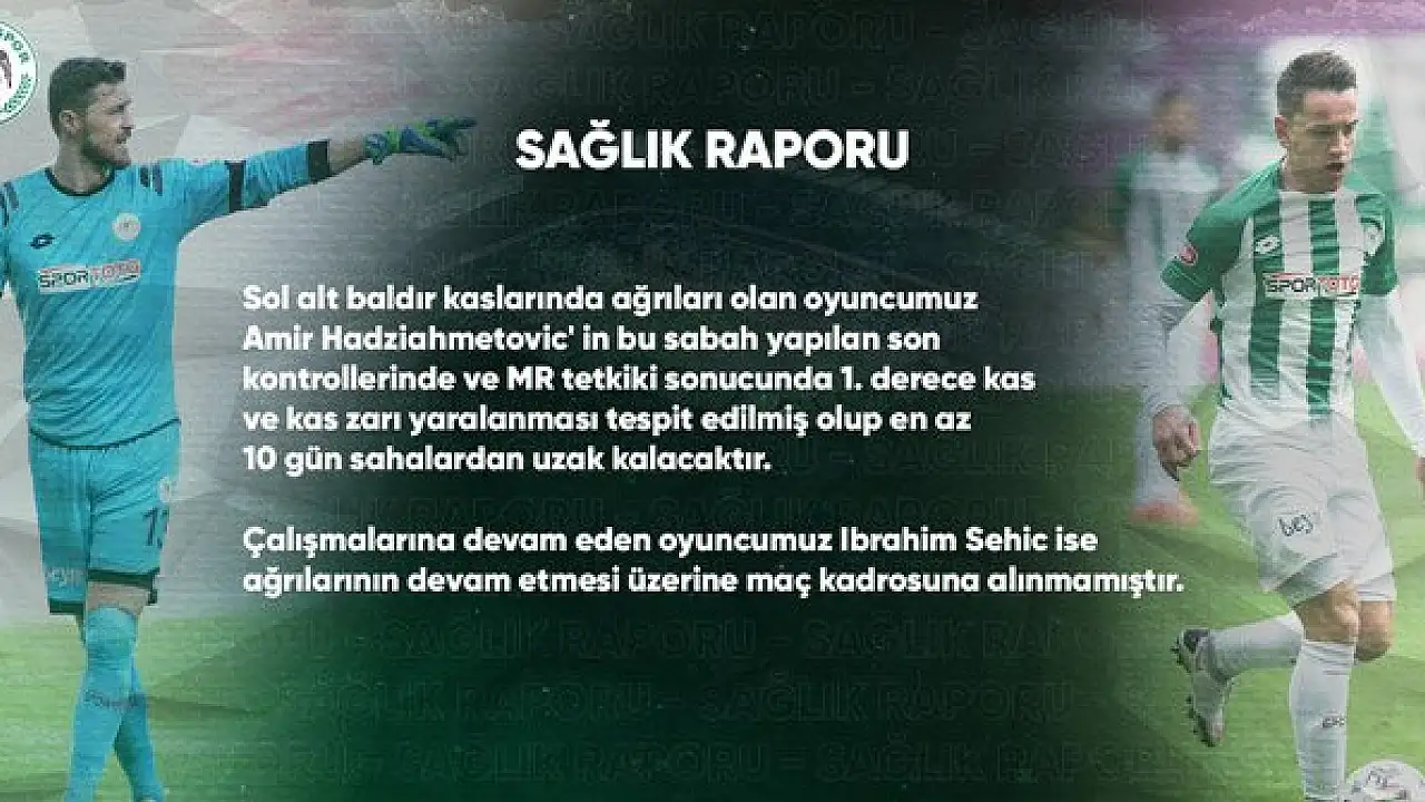 Yeşil beyazlılardan yapılan açıklamada, "Sol alt baldır kaslarında ağrıları olan oyuncumuz Amir Hadziahmetovic'in bu sabah yapılan son kontrollerinde MR tetkiki sonucunda 1. derece kas ve kas zarı yaralanması tespit edilmiş olup en az 10 gün sahalardan uzak kalacaktır.