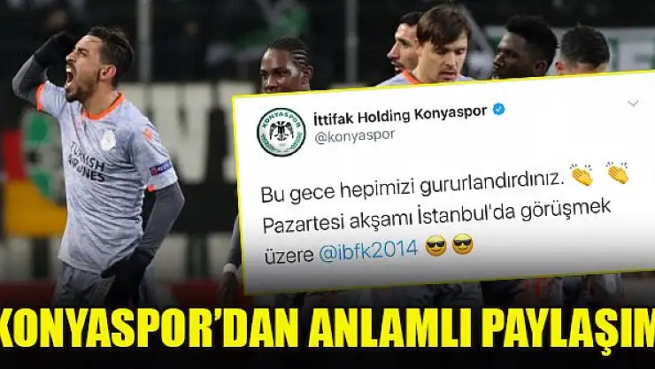 Karşılaşmanın ardından İttifak Holding Konyaspor sosyal medya hesabından paylaştığı gönderiyle Süper Lig'in 15.haftasındaki rakibi Başakşehir'i tebrik etti. Gönderide "Bu gece hepimizi gururlandırdınız. Pazartesi akşamı İstanbul'da görüşmek üzere" ifadelerine yer verildi.