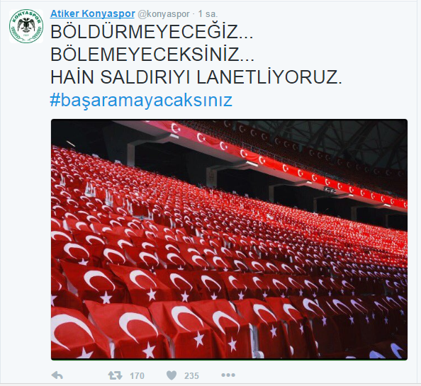 Atiker Konyaspor'un twitter'dan yaptığı paylaşımda, BÖLDÜRMEYECEĞİZ... BÖLEMEYECEKSİNİZ... HAİN SALDIRIYI LANETLİYORUZ. #başaramayacaksınız ifadelerine yer verildi.