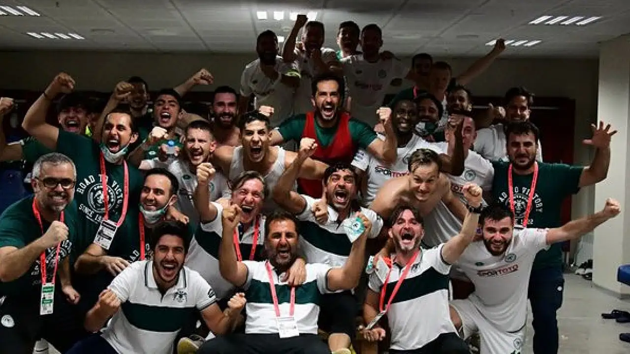 Süper Lig'in 33. haftasında Trabzonspor'u geriden gelerek 4-3 mağlup etmeyi başaran ve ligde kalmayı garantileyen İttifak Holding Konyaspor'da futbolcular ve teknik heyet, soyunma odasında zafer pozu verdi.