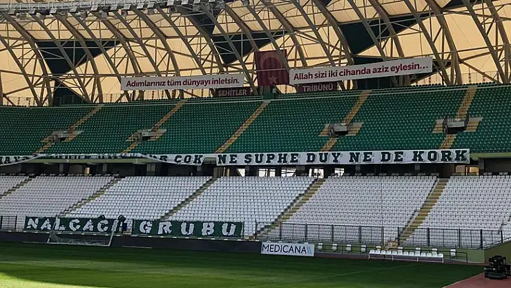 Tribünde terörle mücadele ederken şehit düşen askerlerimizin isimlerinin yanı sıra “Allah sizi iki cihanda aziz eylesin” yazılı pankart tribündeki yerini aldı.