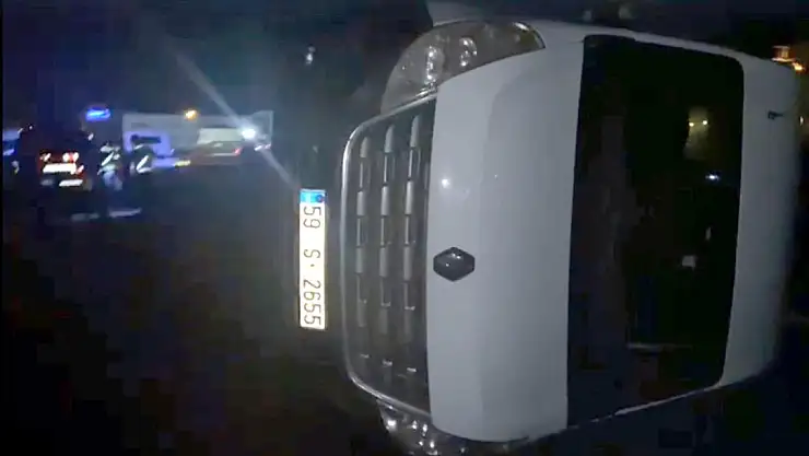 TEKİRDAĞ'ın Çerkezköy ilçesinde, yola fırlayan köpeğe çarpmamak için sürücüsünün manevra yaptığı işçi servisi yan yattı.