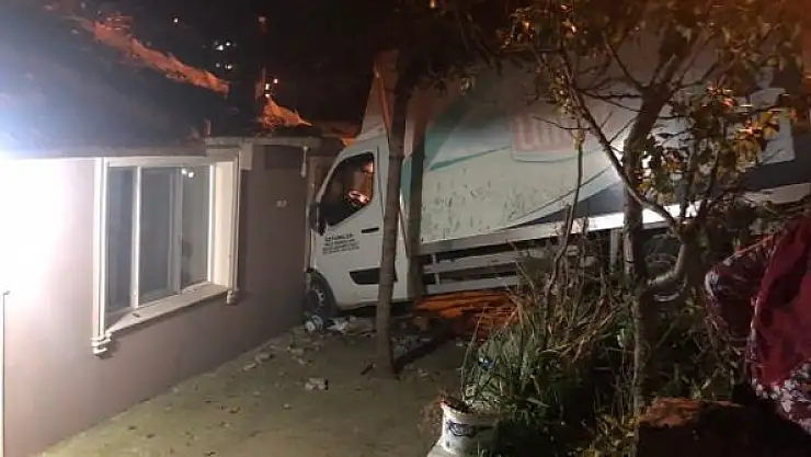 Sakarya'da yaşanan kazada park halindeki bir kamyonet hareket edince bir evin bahçesinden geçti ve evin duvarlarını yıkıp içeri girdi. Ev sakinleri kazayı ucuz atlattı.