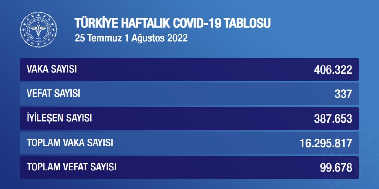 SAĞLIK Bakanlığı'nca açıklanan haftalık Kovid- 19 tablosuna göre, 25 Temmuz- 1 Ağustos tarihleri arasında vaka sayısı 406 bin 322 olurken, 337 kişi koronavirüsten hayatını kaybetti.