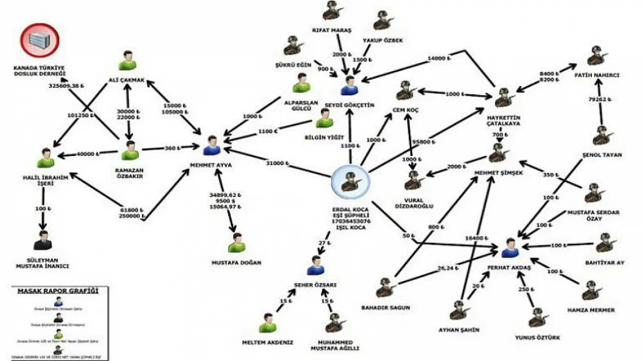 MASAK raporuna, bu kişilerin para transfer ettiği 7 isimden birinin Ramazan Özbakır olduğu, Özbakır'ın Kanada Türkiye Dostluk Derneğine 325 bin 609 lira transfer ettiği yansıdı.