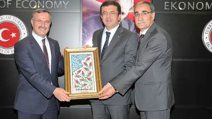 Ziyaretin ardından Konya Sanayi Odası Yönetim Kurulu Başkanı Memiş Kütükcü ve Meclis Başkanı Tahir Şahin, Bakan Zeybekci’ye günün anısına Selçuklu çinisi tablo hediye etti.
