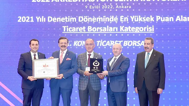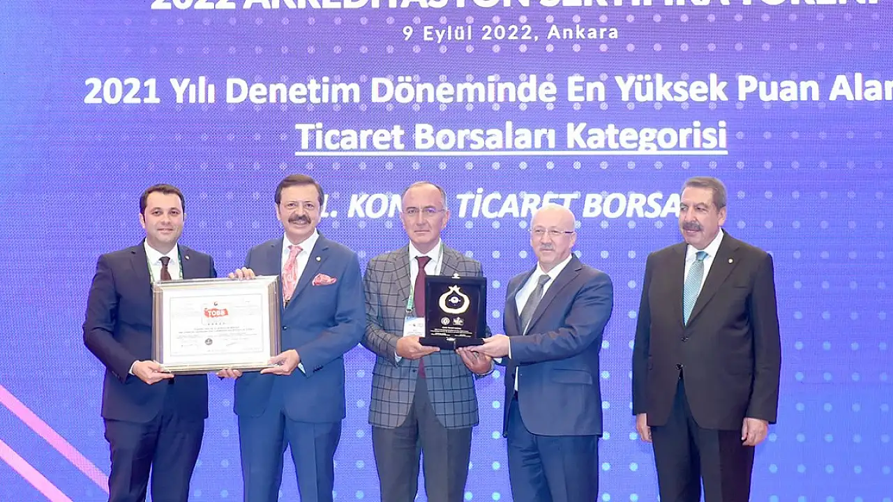 Akreditasyon eğitimlerini tamamlayan ve akreditasyonlarını yenileyen oda ve borsalar sertifika ve plaketlerini Türkiye Odalar ve Borsalar Birliği (TOBB) Konferans Salonu’nda gerçekleşen törenle, TOBB Başkanı M. Rifat Hisarcıklıoğlu ve Ticaret Bakan Yardımcısı Sezai Uçarmak’ın elinden aldı. TOBB Başkanı M. Rifat Hisarcıklıoğlu, söz konusu sertifikanın oda ve borsaların verdiği hizmetin bir belgesi olduğunu söyledi. Törende borsalar arasında en yüksek puanı alarak “A-Seviye” hizmet kalitesinde birinci olan Konya Ticaret Borsası’nın yenilen akreditasyon sertifikası Ticaret Bakan Yardımcısı Sezai Uçarmak ve TOBB Başkanı Rifat Hisarcıklıoğlu tarafından, Yönetim Kurulu Başkan Yardımcısı Mehmet Büyükalim ile Genel Sekreter Esat Bilici’ye verildi. “Bu başarı hizmet kalitemizin göstergesidir” diyen Konya Ticaret Borsası Yönetim Kurulu Başkanı Hüseyin Çevik, “Borsamız, kurulduğu 1907 yılından itibaren vizyoner yönetim kültürü ve uzman personeliyle hizmet standardını sürekli arttırmaktadır. Bugün verilen bu ödül de bunun bir kez daha tescillendiğini göstermiştir. Bu başarı tüm üyelerimize ve borsa personelimize aittir. Biz bunun geliştirilerek sürdürülebilir olması için çalışmalarımıza devam edeceğiz. Bir asrı aşan kurum kültürümüzle etkin Borsa olmayı sürdüreceğiz” dedi.