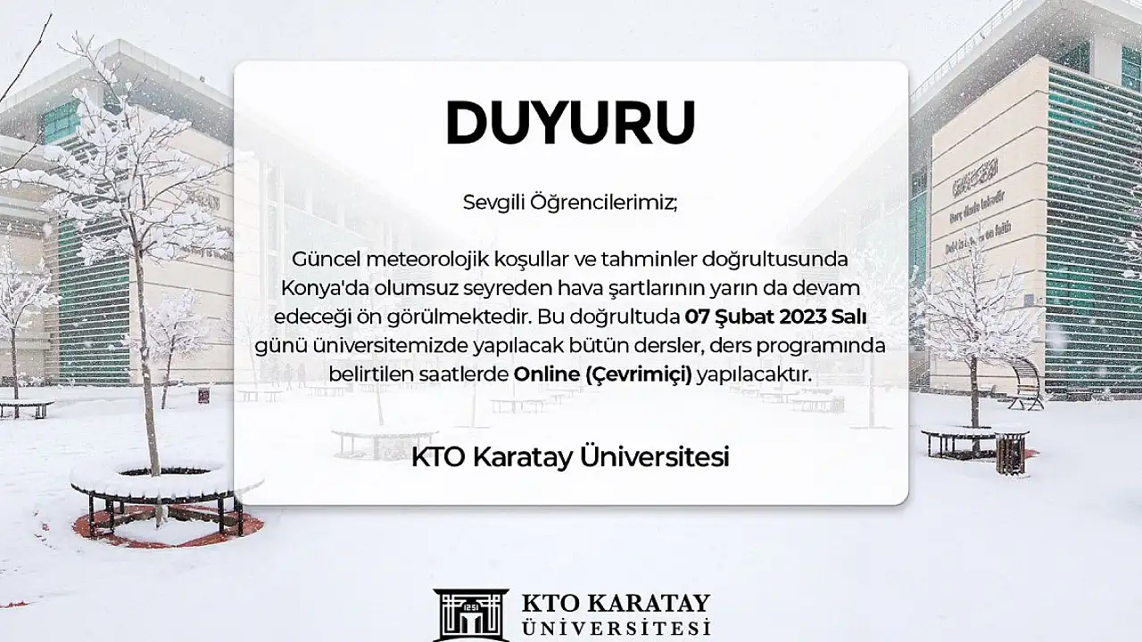 KTO Karatay Üniversitesinden yapılan açıklamada, "Sevgili öğrencilerimiz, güncel meteorolojik koşullar ve tahminler doğrultusunda Konya'da olumsuz seyreden hava şartlarının yarın da devam edeceği öngörülmektedir. Bu doğrultuda 7 Şubat 2023 salı günü üniversitemizde yapılacak bütün dersler, ders programında belirtilen saatlerde çevrimici yapılacaktır" denildi.