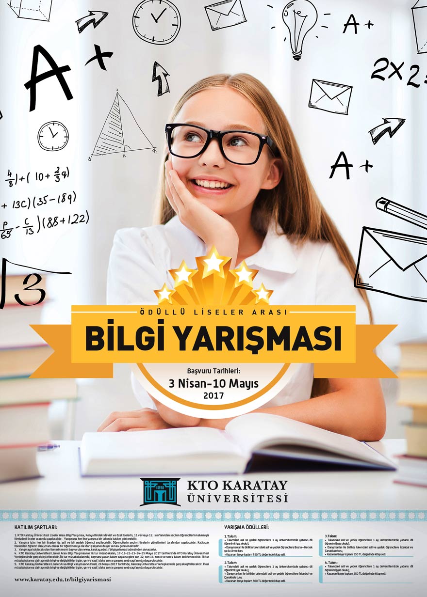 Konya’da eğitim veren liseleri buluşturan KTO Karatay Üniversitesi Liseler Arası Bilgi Yarışması’nın finali de 26 Mayıs 2017 tarihinde, KTO Karatay Üniversitesi Yerleşkesinde gerçekleştirilecek.