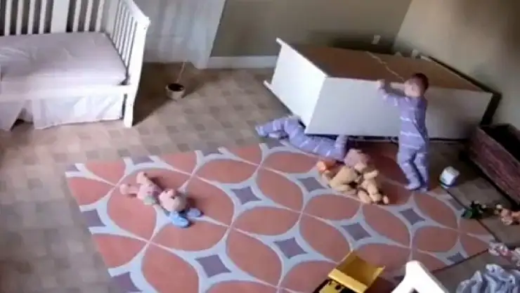 Görüntüler Amerika Birleşik Devletleri’nden. Odalarında oynayan ikiz kardeşlerden biri çekmeye çıkınca devrilen şifonyerin altında kalıyor. Bir süre ne olduğunu anlamaya çalışan kardeşi ise durumu anlayınca kardeşini kurtarmaya çalışıyor. Kendisinden katbekat olan ağır olan mobilyayı itmeyi başaran minik çocuk kardeşini kurtarırken o anlarsa anbean kameraya yansıyor.