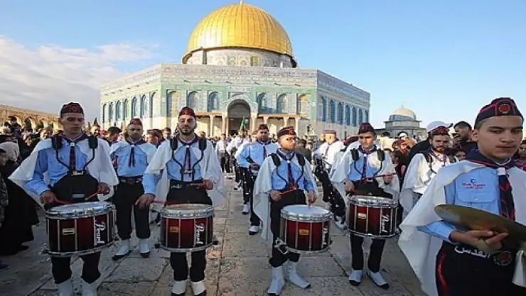 Filistinli öğrenciler Mevlid-i Nebi etkinlikleri kapsamında bando çalarak Mescid-i Aksa'ya yürüdü.
