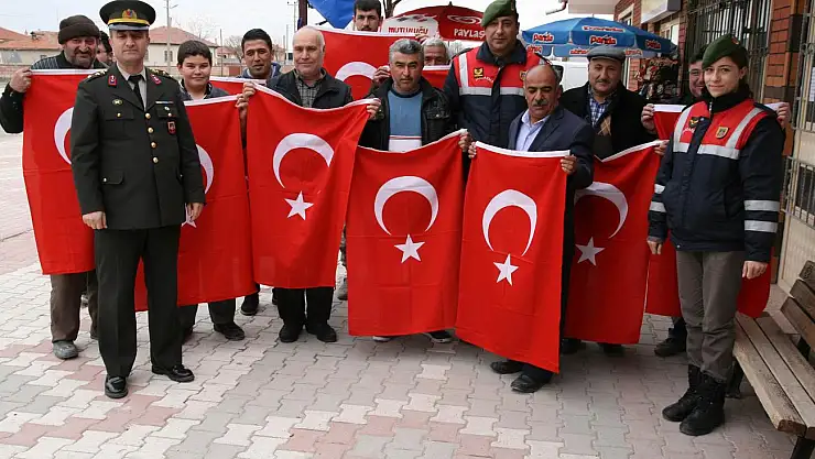 18 Mart Çanakkale Zaferi'nin 100. Yıldönümü ve Şehitleri Anma Günü dolayısıyla İlçe Jandarma Bölük Komutanı Yüzbaşı Mikail Arıkan, Jandarma Merkez Karakol Komutanı Tunay Torun ve askerler tarafından ilçeye bağlı mahalleler gezilerek, vatandaşlara 3 bin 837 adet Türk bayrağı hediye edildi.