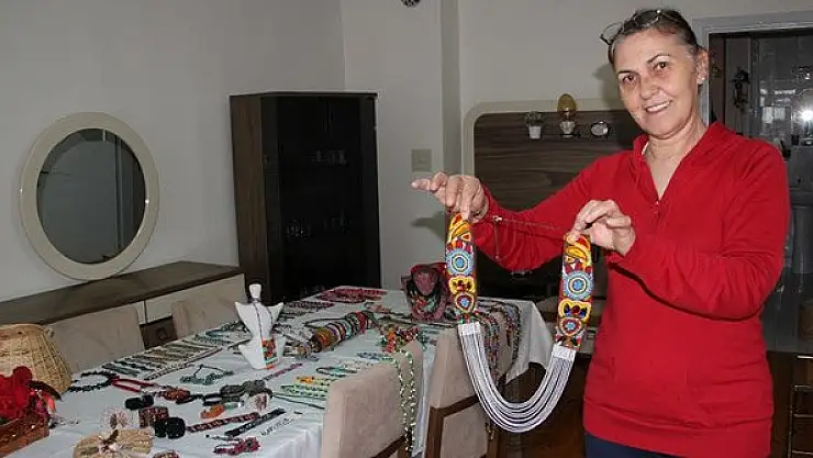 Seydişehir Alaylar-2 Mahallesinde yaşayan Coşkun, kadın çanta süsleme işi ile başladığı el sanatları beceresini kum boncuktan takı işiyle devam ettirdi.