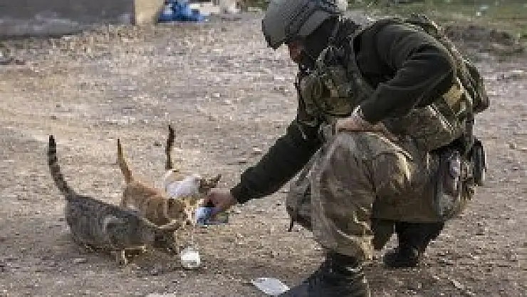 Güvenlik kuvvetleri, arama-tarama faaliyeti yürüttükleri sokaklarda gördükleri ve operasyonlar süresince ilçede aç kalan kedi ve köpeklerle yakından ilgileniyor. Beraberlerindeki kumanyaları sokak hayvanlarıyla paylaşan ekipler, hayvanların daha kolay beslenebilmesini sağlamak için de plastik kutulardan kaplar yapıp yiyecekleri içine bırakıyor.