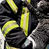 Kurtarılan kedi itfaiye erinin kucağından inmedi