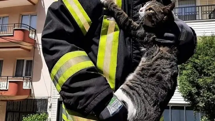 Manisa'nın Turgutlu ilçesine bağlı Cumhuriyet Mahallesi Mektep Sokak'taki 4 katlı bir apartmanın ikinci katında mahsur kalan kediyi gören vatandaşlar durumu itfaiye ekiplerine bildirdi. Haber verilmesiyle olay yerine gelen Manisa Büyükşehir Belediyesine bağlı itfaiye ekipleri mahsur kalan kediyi kurtarmak için çalışma başlattı. Merdivenli araç yardımıyla kurtarılan kedinin oldukça korktuğu dikkat çekerken, kendisini kurtaran itfaiye erinin kucağından inmedi. Uzun süre itfaiye erinin kucağında kalan kedi sağlık kontrolleri yapıldıktan sonra yeniden sokağa salındı.